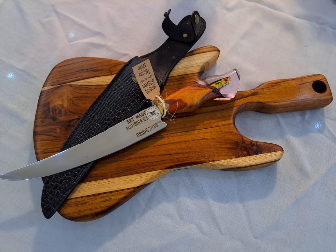 Kit Churrasqueiro composto por tábua em Teca tratado com óleo mineral e cera de abelha mais faca picanheira.